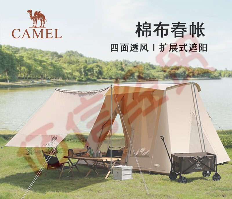 骆驼(CAMEL)户外精致露营野外棉布加厚天幕帐篷野营便携式屋脊春日帐装备 1V32267130,流沙色 自营