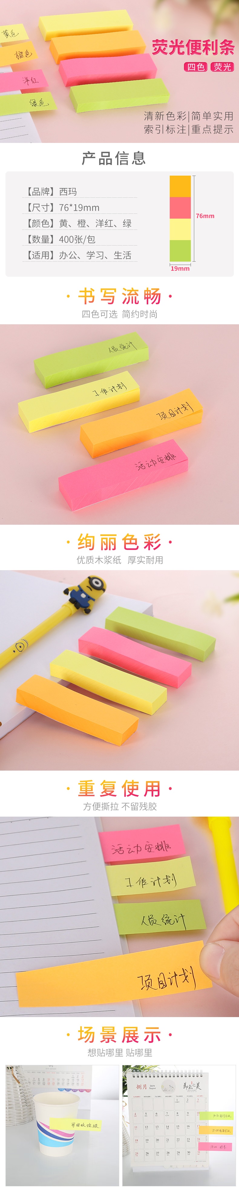 西玛(SIMAA)400张4色便利贴荧光小条便签纸 76*19mm记事贴N次贴 学生留言8452(10个起售) 自营