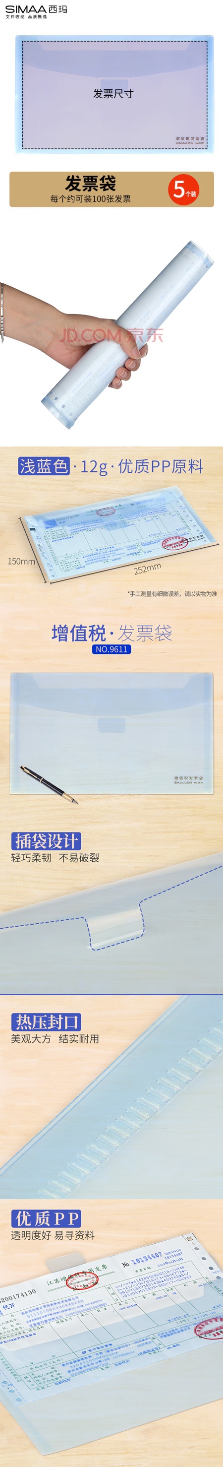 西玛(SIMAA)5个装 发票袋/增值税发票套/文件袋蓝 9611(10个起售) 自营