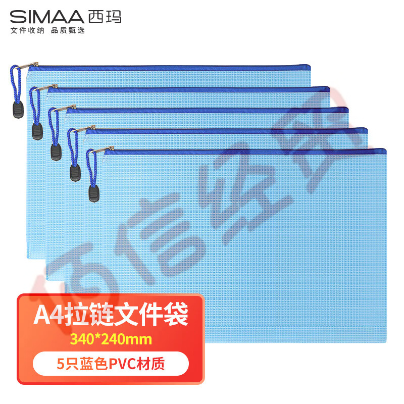 西玛(SIMAA)5只蓝色A4拉链袋 软质文件袋 防水资料袋 办公收纳袋6790 自营