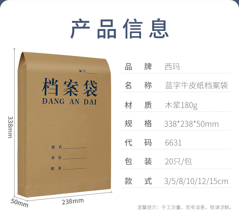西玛6631木浆牛皮纸档案袋蓝字5cm-20 6631 进口木浆180g 240*340*50mm 20个/包 25包/箱(红、蓝两色下单跟客服联系)(整箱售) 自营