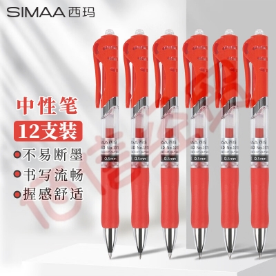 西玛(SIMAA)中性笔签字笔按动笔子弹头/水笔/0.5mm会议签字笔 红色 12支装办公用品19788 自营