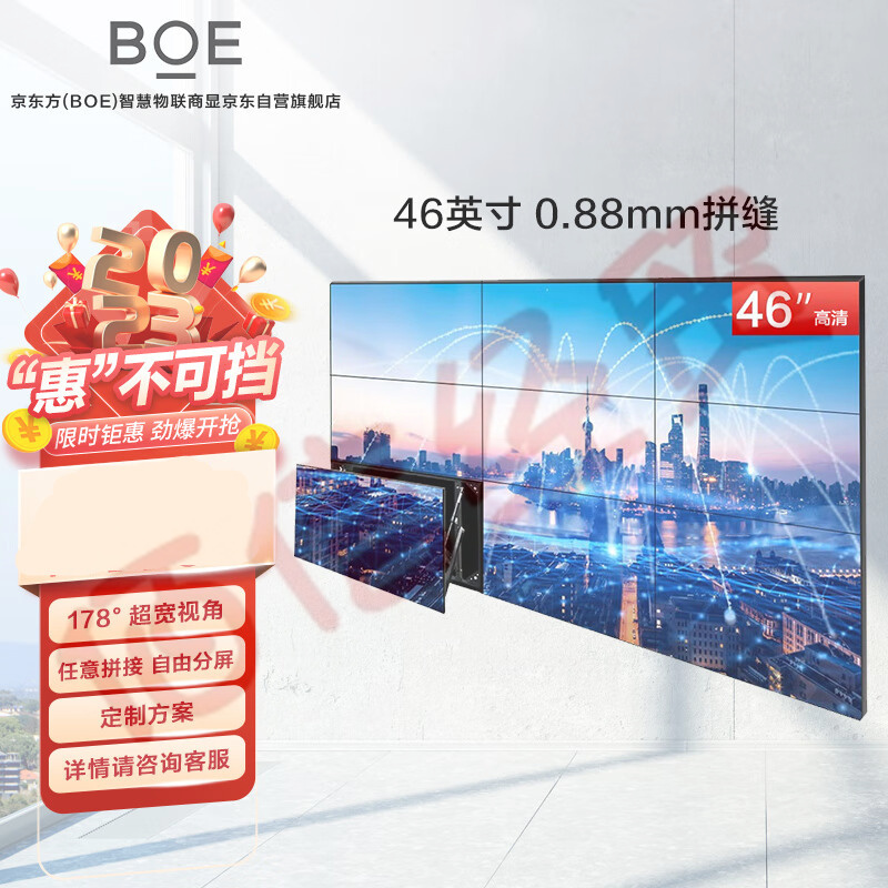 ¥9457.00京东方(BOE)广告显示屏自营拼接屏电视墙无缝0.88mm低亮拼缝超窄边46英寸显示(9块屏 价格)