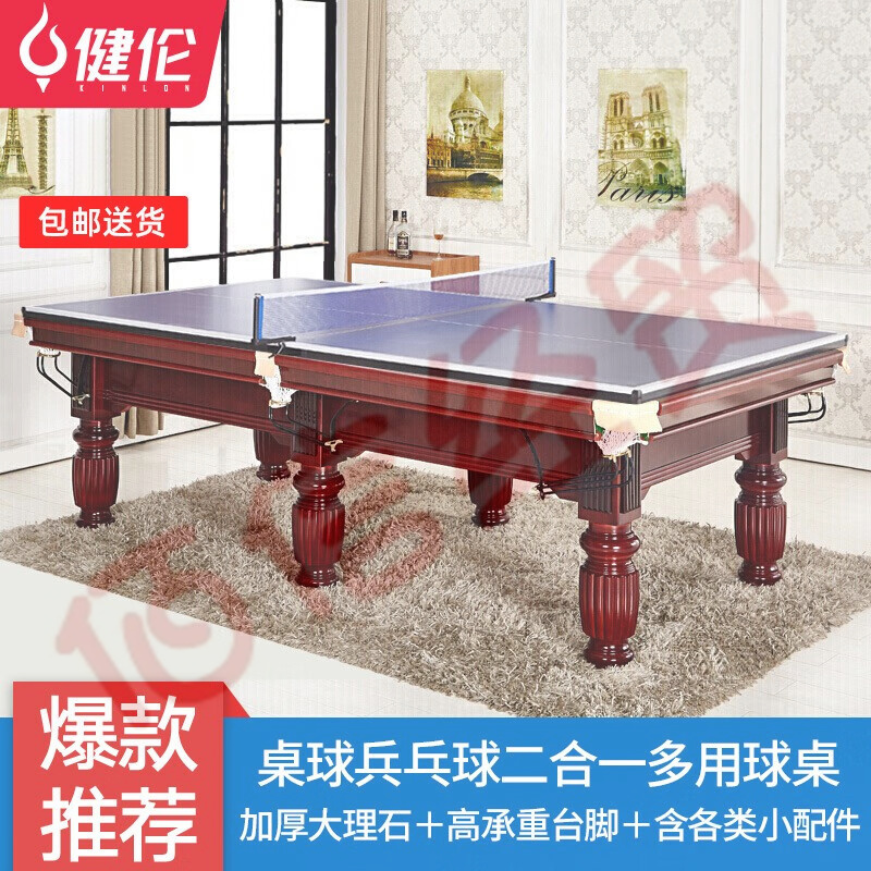 健伦(JEEANLEAN) 台球桌 标准成人家用桌球台美式黑八落袋台球案二合一乒乓球 二合一球桌标配(金/银/棕) 自营