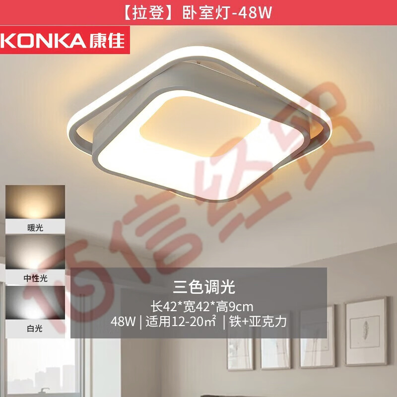 康佳(KONKA)客厅灯卧室灯现代大气新款led北欧餐厅吸顶灯全屋套餐灯具 48瓦-三色调光方卧室灯 自营