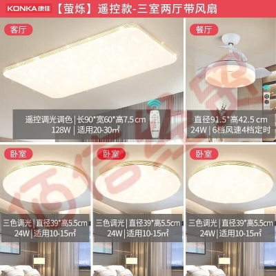 康佳(KONKA)客厅灯卧室护眼吸顶灯书房儿童房防蓝光防频闪led 3室2厅/带风扇 自营