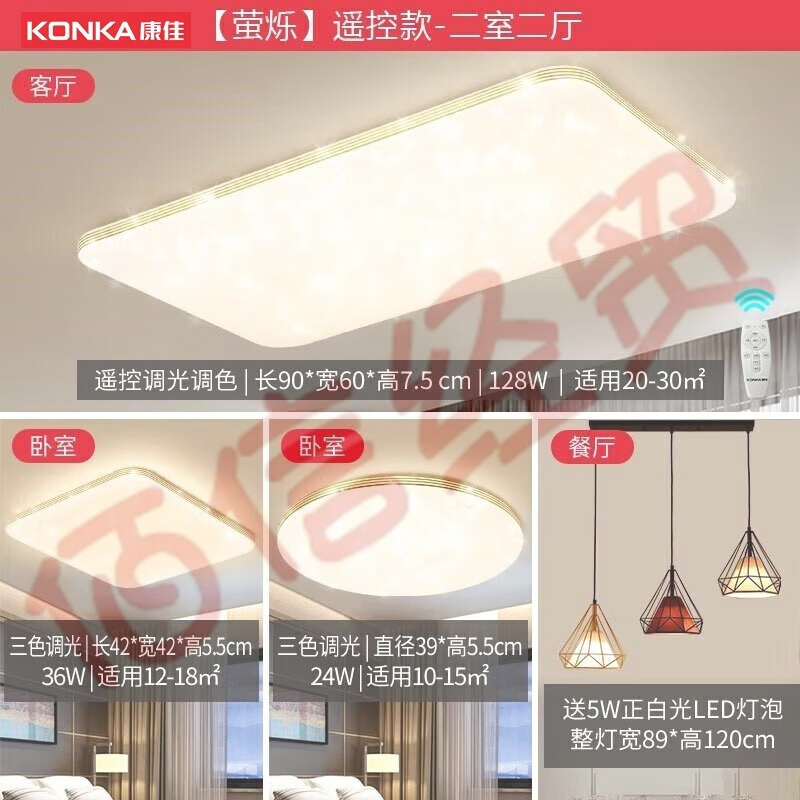 康佳(KONKA)客厅灯卧室护眼吸顶灯书房儿童房防蓝光防频闪led 2室2厅 自营
