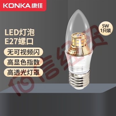 康佳(KONKA)LED灯泡尖泡双色可选客厅灯壁灯水晶灯吊灯家用替换灯 E27-KQP6042-5DWG/5W3000K 自营