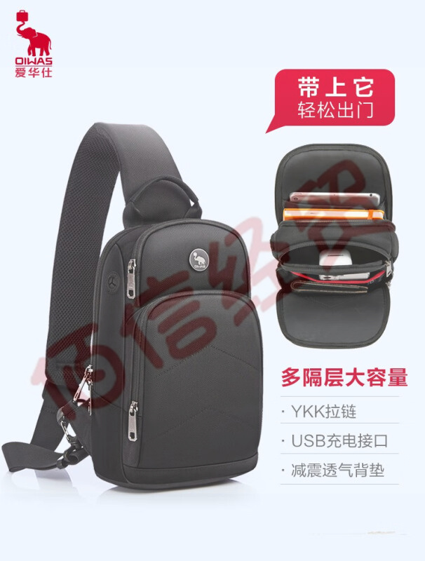 爱华仕男士胸包单肩包休闲运动斜挎包男士通勤包包大学生轻便手机包5673 黑色 自营