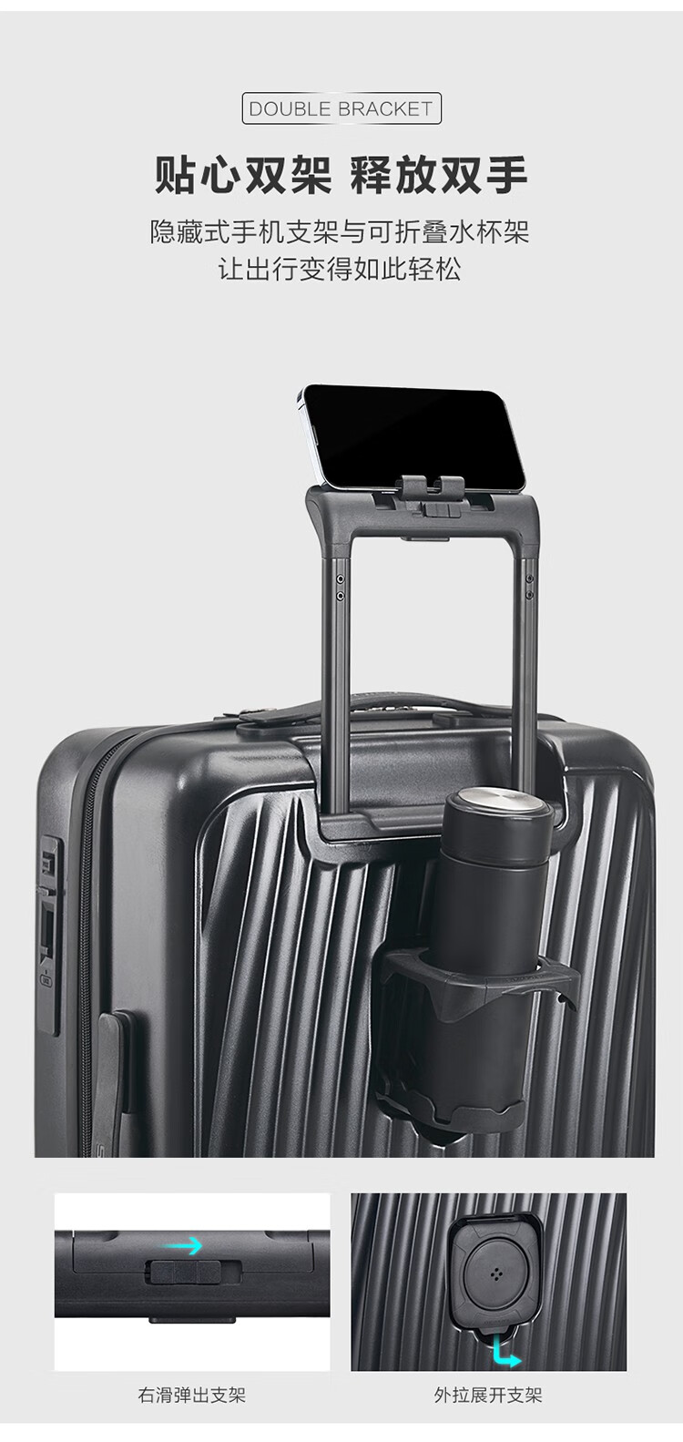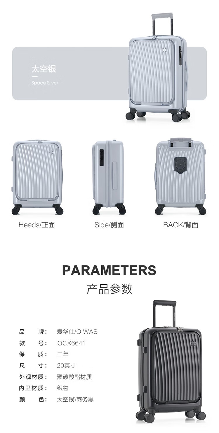 爱华仕前开盖商务行李箱男拉杆箱可充电20英寸登机箱旅行箱女密码箱6641 黑色、银色 20英寸(登机箱) 自营