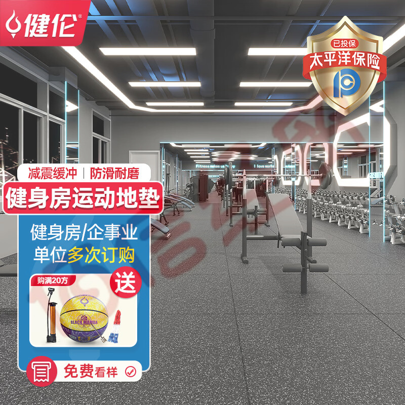 健伦健身垫隔音地胶垫橡胶地垫防滑减震防滑缓冲地板50*50*5.0带槽款 自营