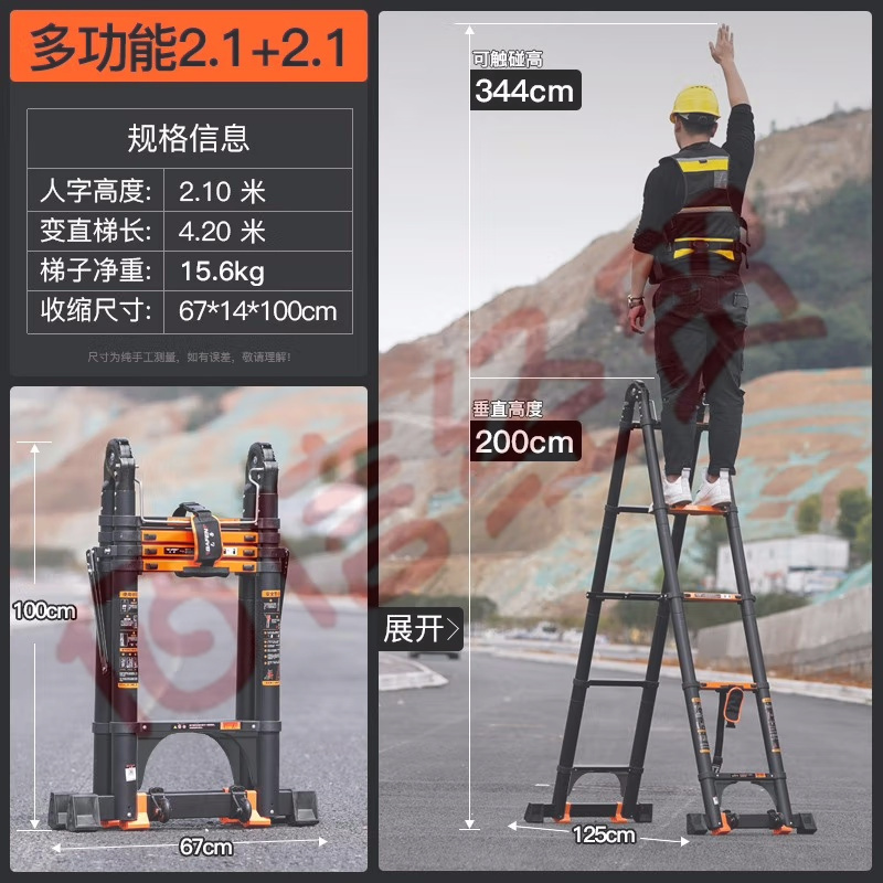 巴芬伸缩梯多功能梯子家用梯人字梯加厚铝合金工程梯升降直梯折叠楼梯 多功能2.1米【拱桥防晃+防滑】 自营