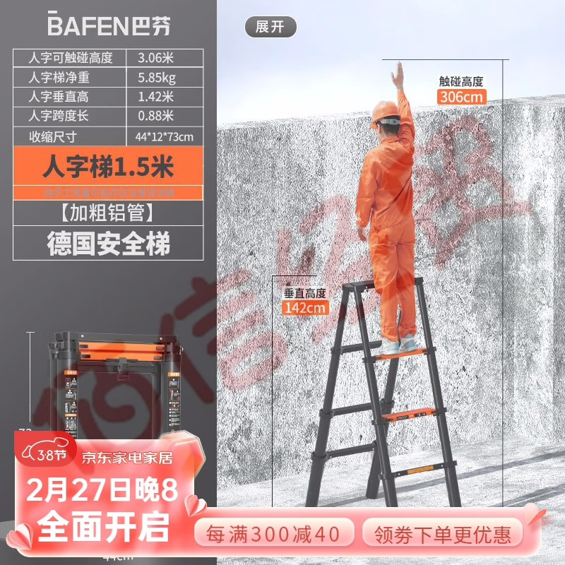 巴芬伸缩梯多功能梯子家用梯人字梯加厚铝合金工程梯升降直梯折叠楼梯 人字梯1.5米【不带平衡杆轮子】 自营