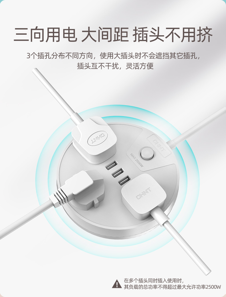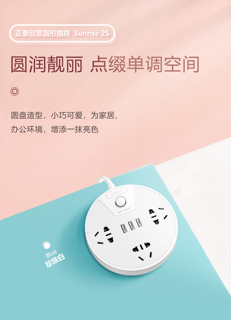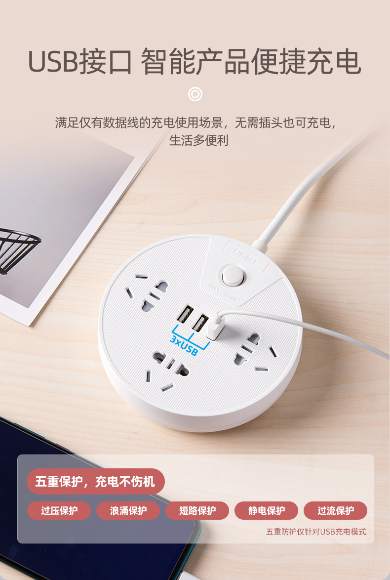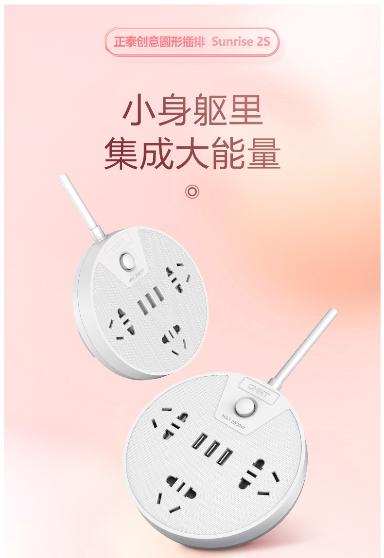正泰插座插排多功能家用圆形USB排插宿舍学生插板带线接拖插线板Sunrise2S-1030U/06插位+3USB白色-1.5m 自营