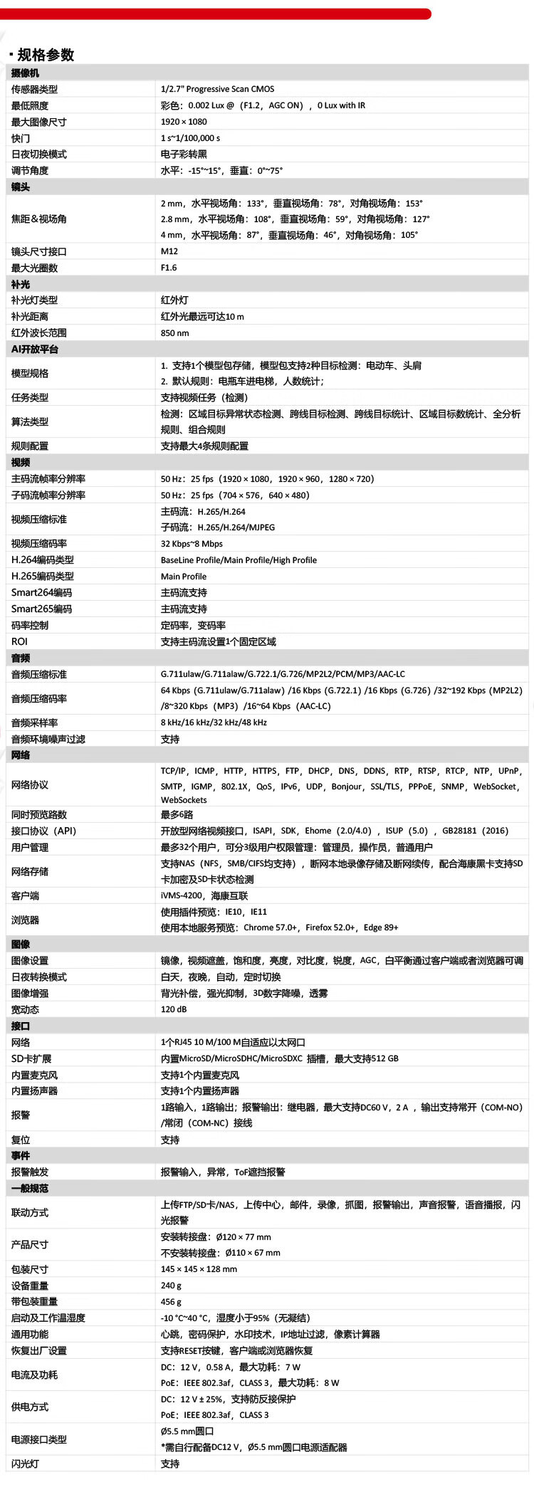 2.8 mm,水平视场角:108°,垂直视场角:59°,对角视场角:127°