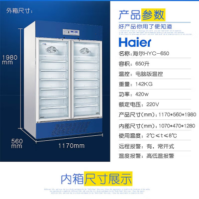 海尔(Haier)药品冷藏箱 2-8℃医药冷藏柜风冷无霜冰柜医药冷柜 药品保鲜柜HYC-650 自营
