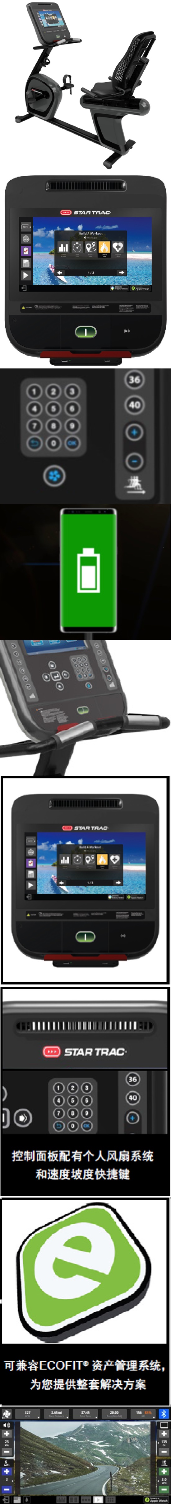 Star Trac® 星驰4系列靠背单车完美契合企业、酒店、会所、康复等垂直市场的需求,配有电容触摸屏,阻力快速调节键,RUNTV 内置训练视频,内置APPS,为用户的训练增添更多娱乐功能,是您的绝佳选择。