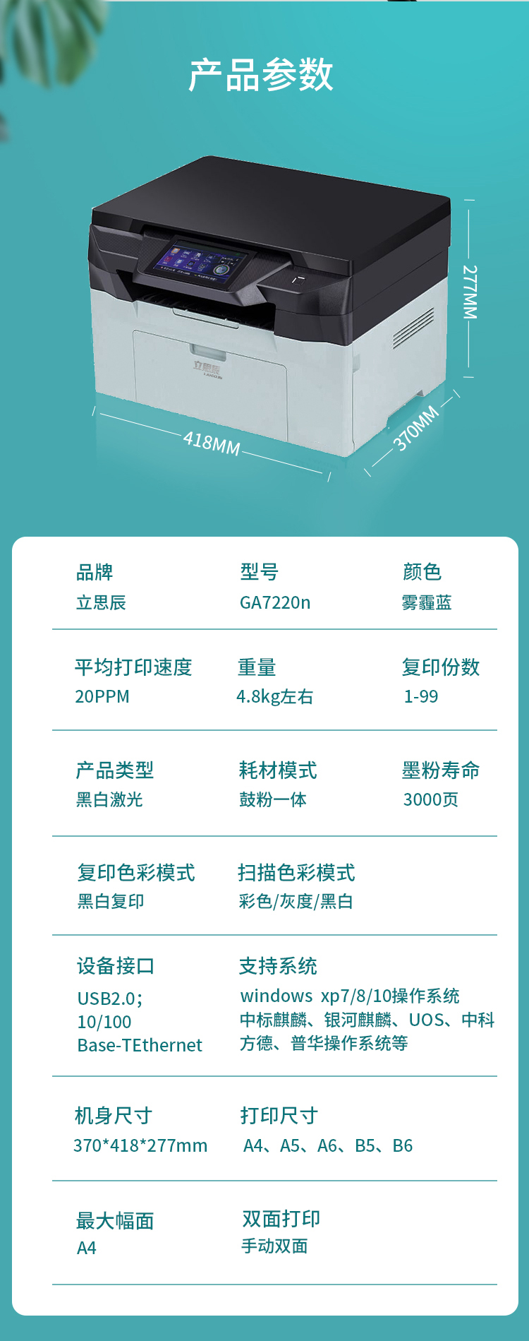立思辰(LANXUM)A4黑白多功能一体机GA7220n、A4幅面、黑白激光、打印/扫描/复印 自营