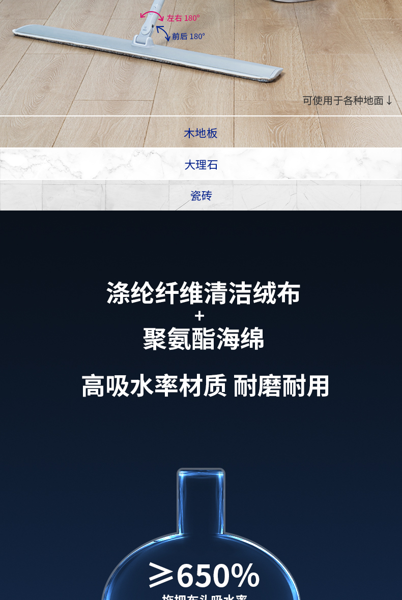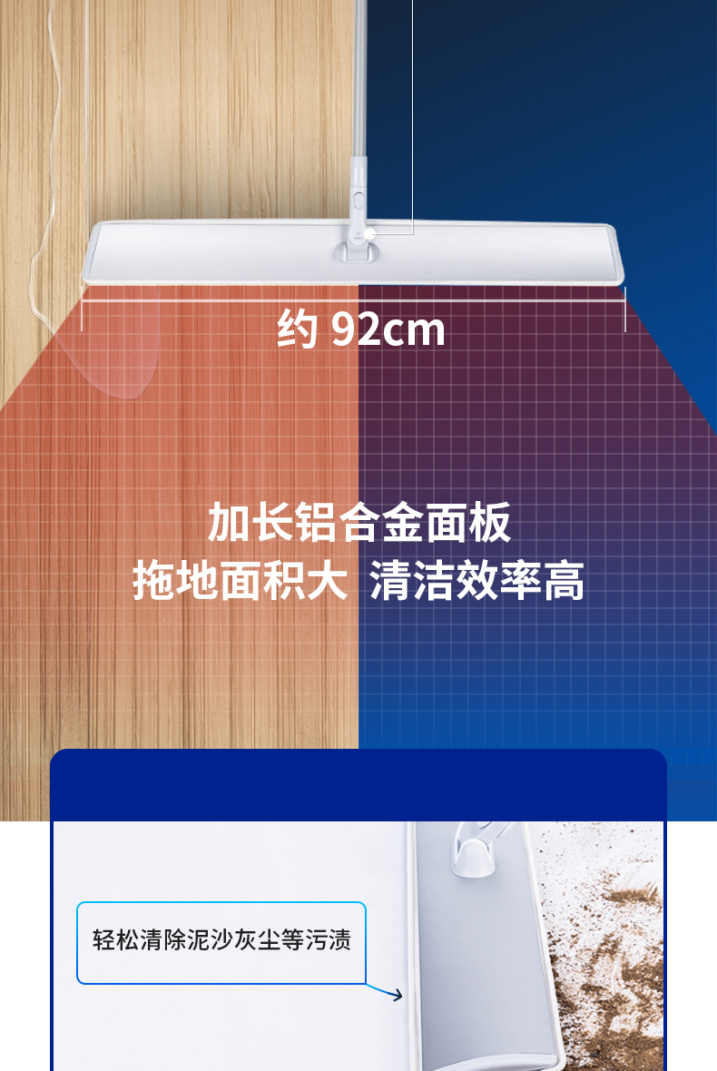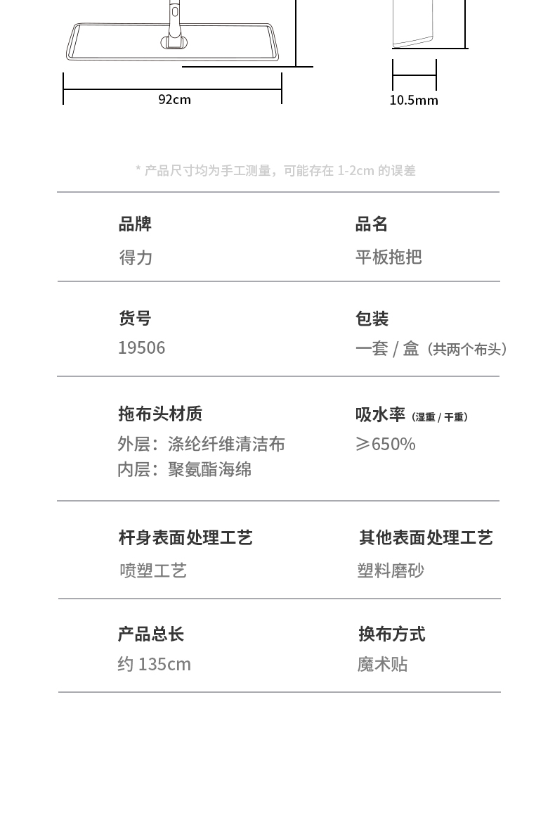 得力(deli)90cm平板拖把 高质感铝合金面板 魔术贴拖布设计易更换 拖布干湿两用快速吸水 2块拖布 19506 自营