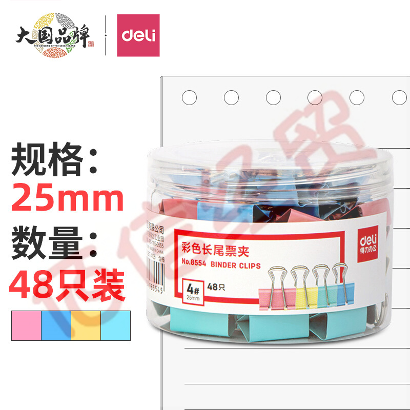 得力(deli)48只25mm彩色长尾夹票夹文件夹 4#金属燕尾夹票据夹子 办公用品 8554 自营