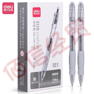 得力(deli)【顺滑之星】臻顺滑系列0.5mm子弹头中性笔 无印风签字笔水笔办公文具 黑色 12支/盒 S128 自营