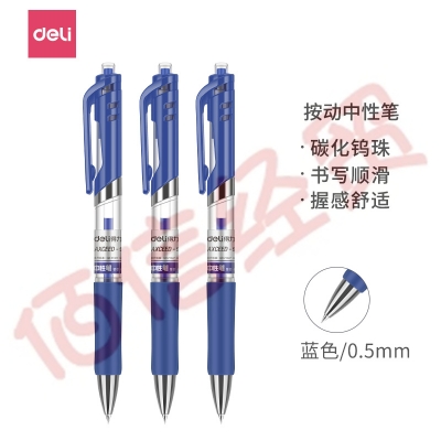 得力(deli)S01中性笔签字笔 0.5mm子弹头经典办公按动笔水笔 蓝色 12支/盒 自营