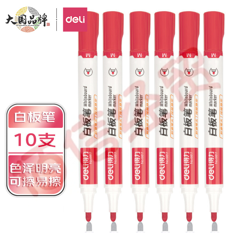 得力(deli)白板笔 色泽明亮可擦易擦 红色10支/盒6817 办公用品(新老款随机发货) 自营