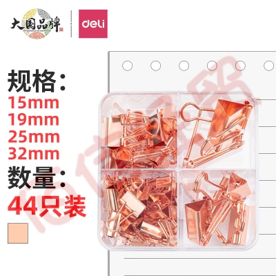 得力(deli)-44只-玫瑰金长尾夹-组合装(32mm*2只+25mm*5只+19mm*12只+15mm*25只) -78205 (每包4盒) 自营