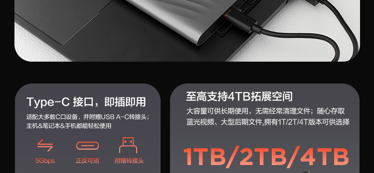 联想出品 ThinkPlus 1TB移动固态硬盘Type-C USB3.2高速传输540MB/s轻薄便携手机直连备份平板电脑外置存储器