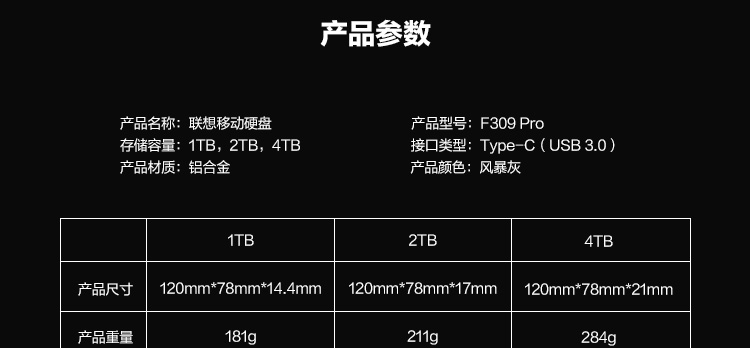 联想(Lenovo)4TB F309Pro 移动硬盘 Type-C高速传输全金属 稳定耐用
