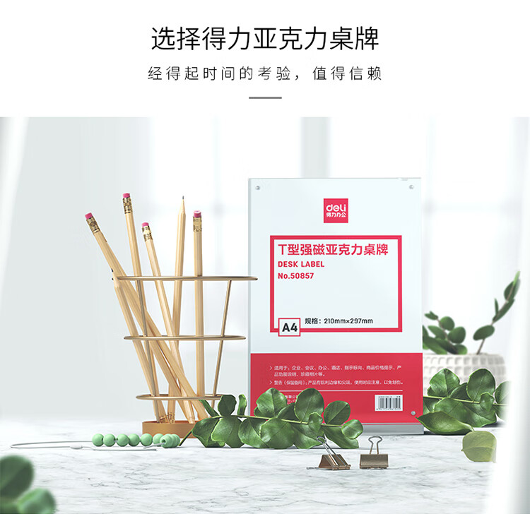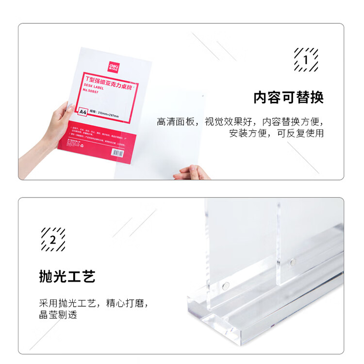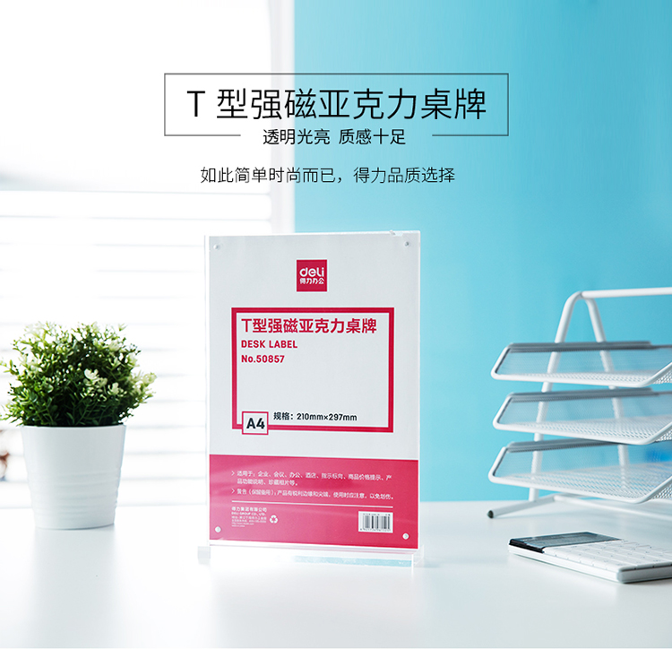 得力(deli)T型A4竖式透明强磁吸附亚克力桌牌/展示牌/台卡/酒水牌 50857 自营