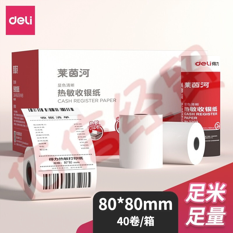 得力3203莱茵河热敏收银纸80*80mm餐饮外卖收银机打印纸 超市收银小票纸 40卷(60米/卷)单卷足米 自营