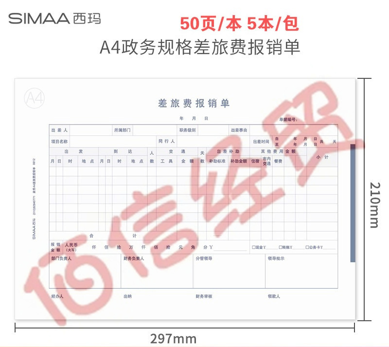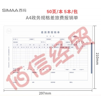 西玛表单 西玛(SIMAA)A4政务差旅费报销单 297*210mm 50页/本 5本/包-8812--12包/箱(单价)(整箱售) 自营