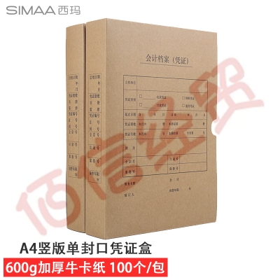 西玛(SIMAA) 100个/包 A4竖版凭证盒单封口 600g加厚牛卡纸 220*305*50mm HZ351 整箱价 自营