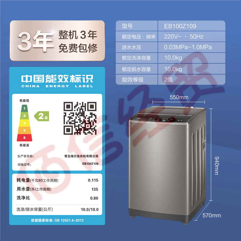 海尔(Haier)波轮洗衣机全自动 内衣除螨洗 脱水机 原厂品质 10公斤大容量 EB100 Z109 自营