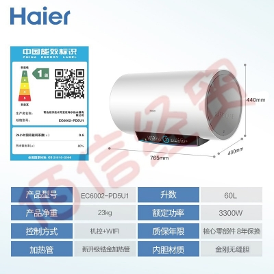 海尔(Haier)60升电热水器3300W变频镁棒免更换健康可视金刚无缝胆WIFI控EC6002-PD5(U1) 自营