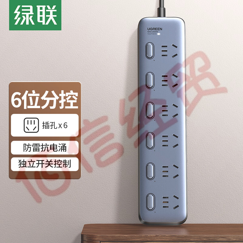 绿联 新国标6位分控防雷插座 抗电涌防电涌插线板/插排/排插/插板/接线板/拖线板 独立开关全长2米 90861 自营