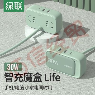 绿联(UGREEN) 30W智充魔盒 多口PD快充头充电器+排插二合一 适用苹果华为手机笔记本电脑 【30W】充电排插多合一智充魔盒-抹茶绿 自营