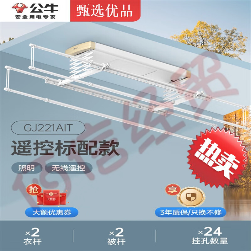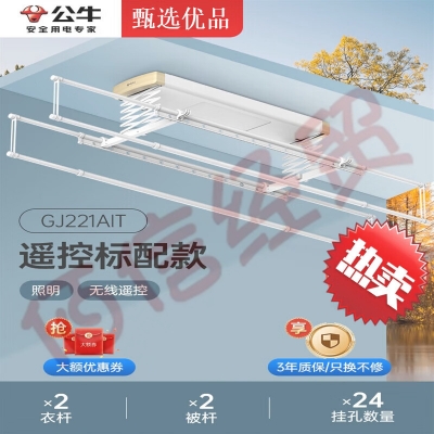 公牛晾衣架公牛智能电动晾衣架遥控升降衣被同晒智能语音控制智能 基础款照明+遥控+24孔+4晾杆GJ221AT 自营