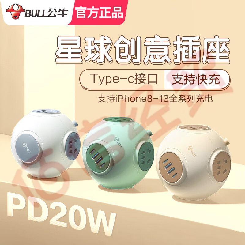公牛星球魔方插座带usb快充多功能扩展插线板充电排插板带线 陨星岩【球形-2位20W快充款】4插位1.5米U1--U104Q(A316) 自营