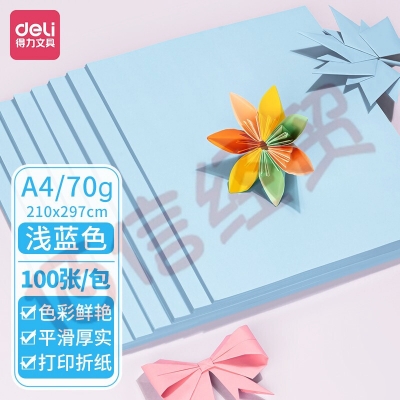 得力(deli)7391 复印纸 彩色打印纸 儿童手工折纸剪纸彩纸 非硬卡纸 A4 70g浅蓝色 100张/包 自营