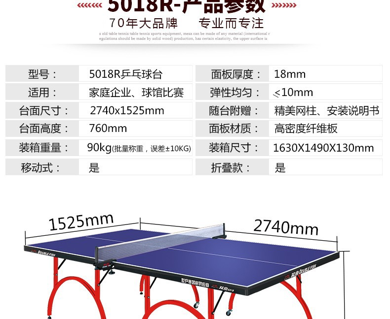 双鱼(DOUBLE FISH) 乒乓球桌标准乒乓球台室内移动折叠式乒乓球案子 5018R球台 自营