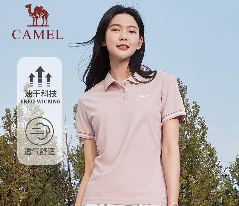 骆驼(CAMEL)运动polo衫休闲短袖2023春夏运动速干透气宽松翻领上衣 6004,山茶粉,女 S 自营