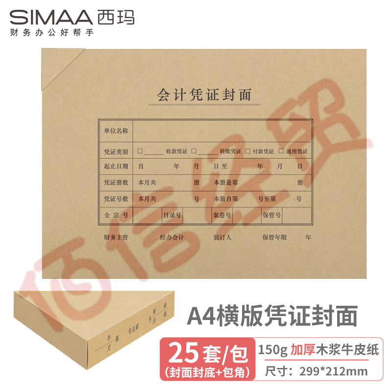 西玛(SIMAA)A4凭证封面套包25套(封面+包角)加厚木浆150g 299*212mm 配套a4记账凭证纸费用报销粘贴单据6504B;封面+包角25套/包,10包/箱(单包价-整箱售-拍25组) 自营