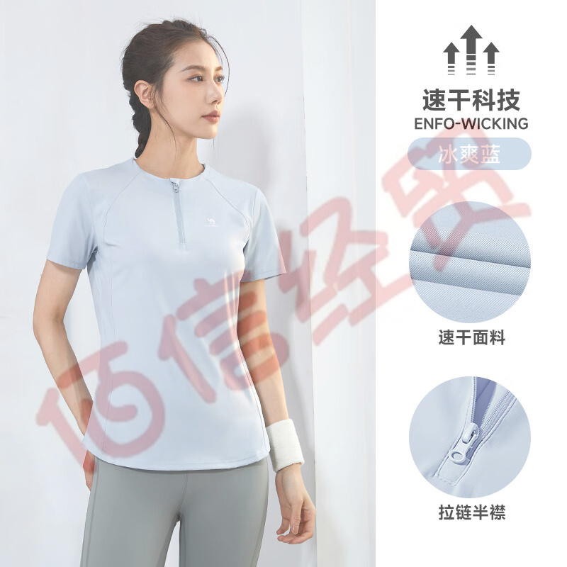 二澈雀运动短袖T恤速干衣女士2023夏季跑步瑜伽健身训练服立领上衣 C23BABH393,冰爽蓝,女 S 自营