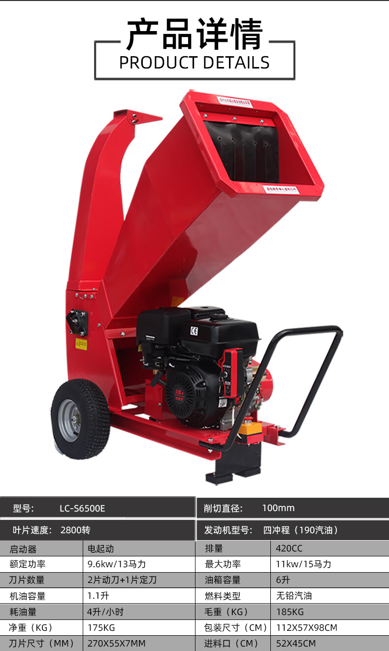 利晨木材树枝粉碎机大型多功能园林碎木果园绿化移动式汽油葡萄枝秸秆汽油树木秸秆粉碎机碎木机碎枝机S6500E 自营