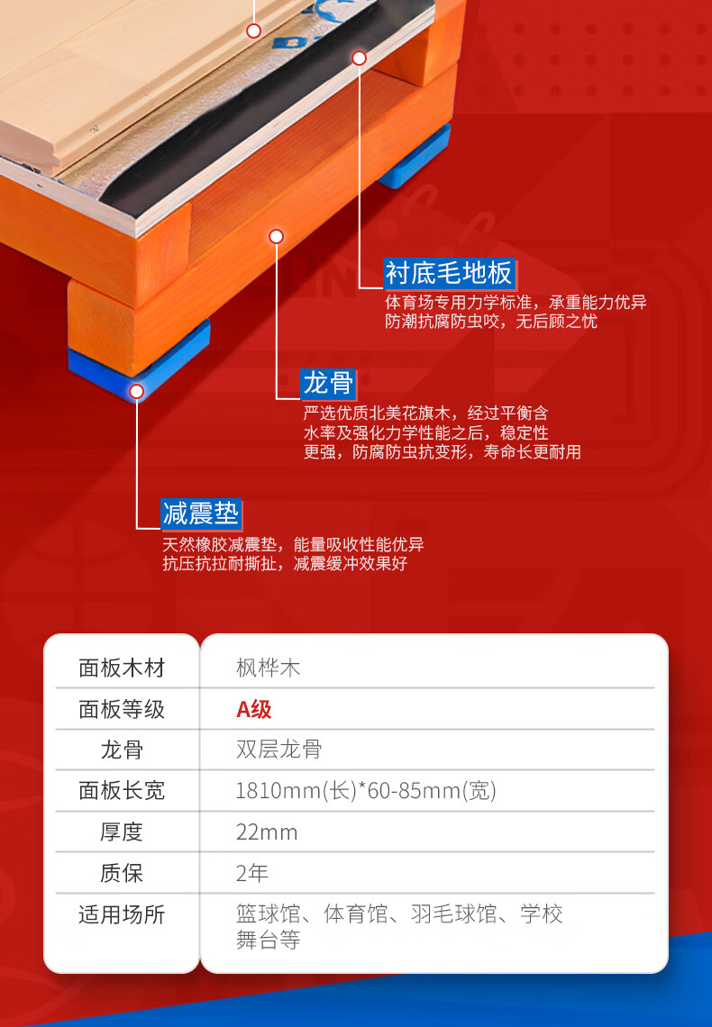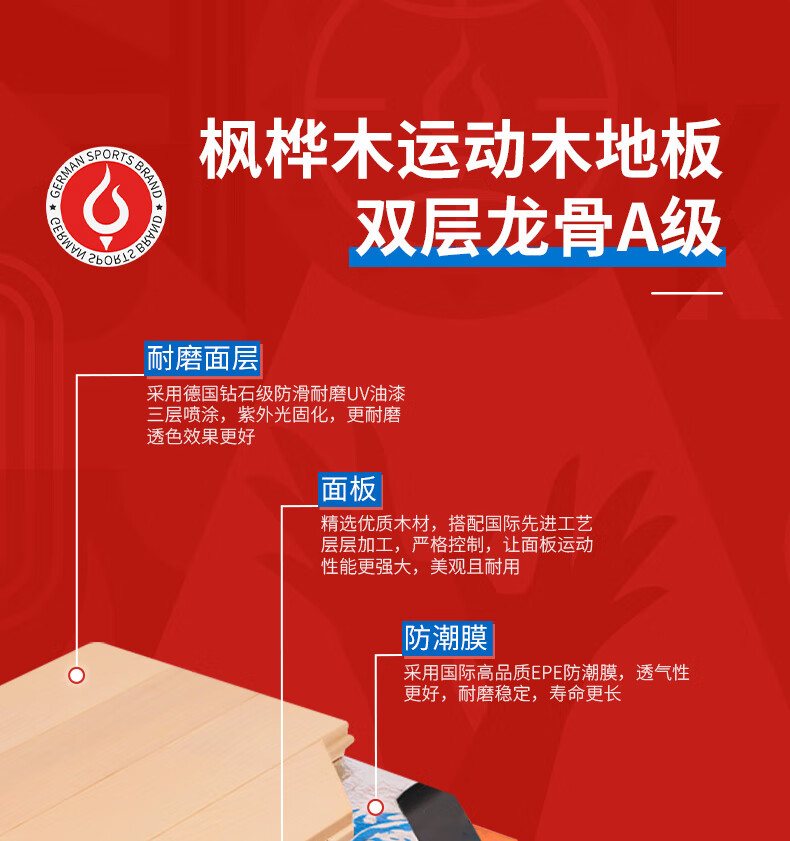 健伦(JEEANLEAN)运动木地板室内篮球场体育馆 双层龙骨 A级枫桦木JLGDF2 自营
