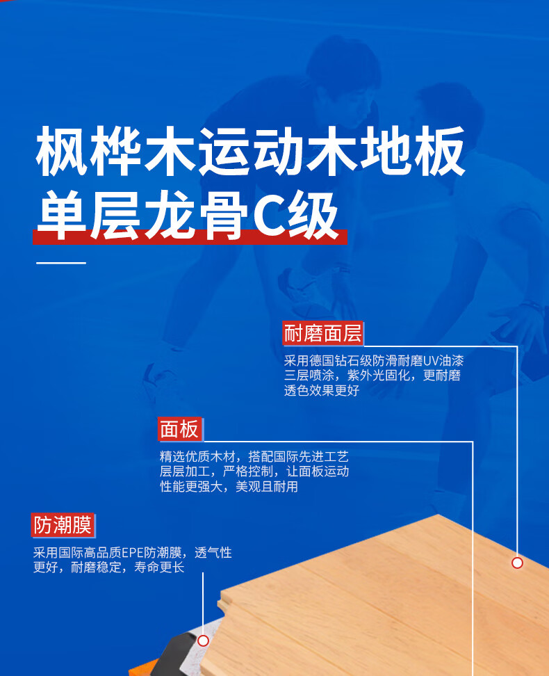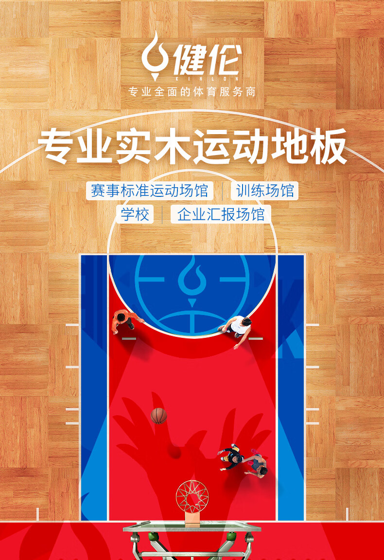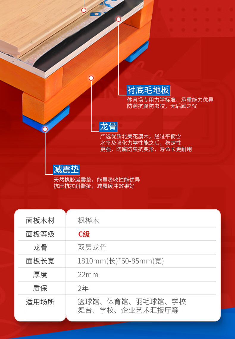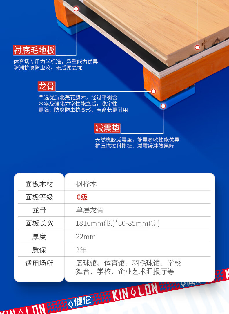 健伦篮球场实木运动地板室内体育馆羽毛球场舞蹈室枫桦木双龙骨C级 自营