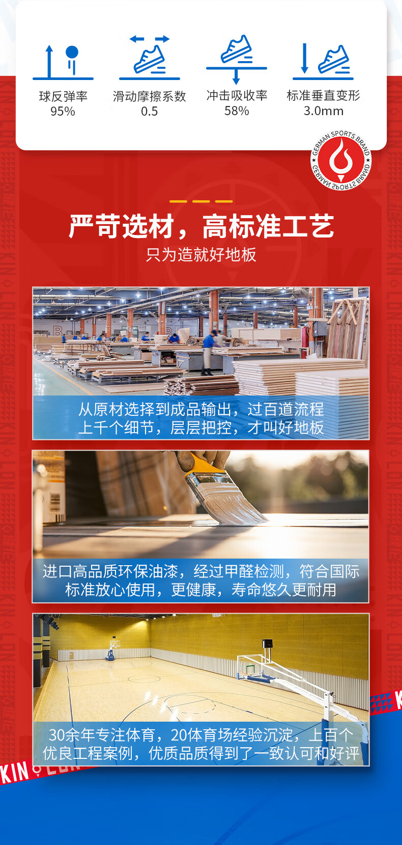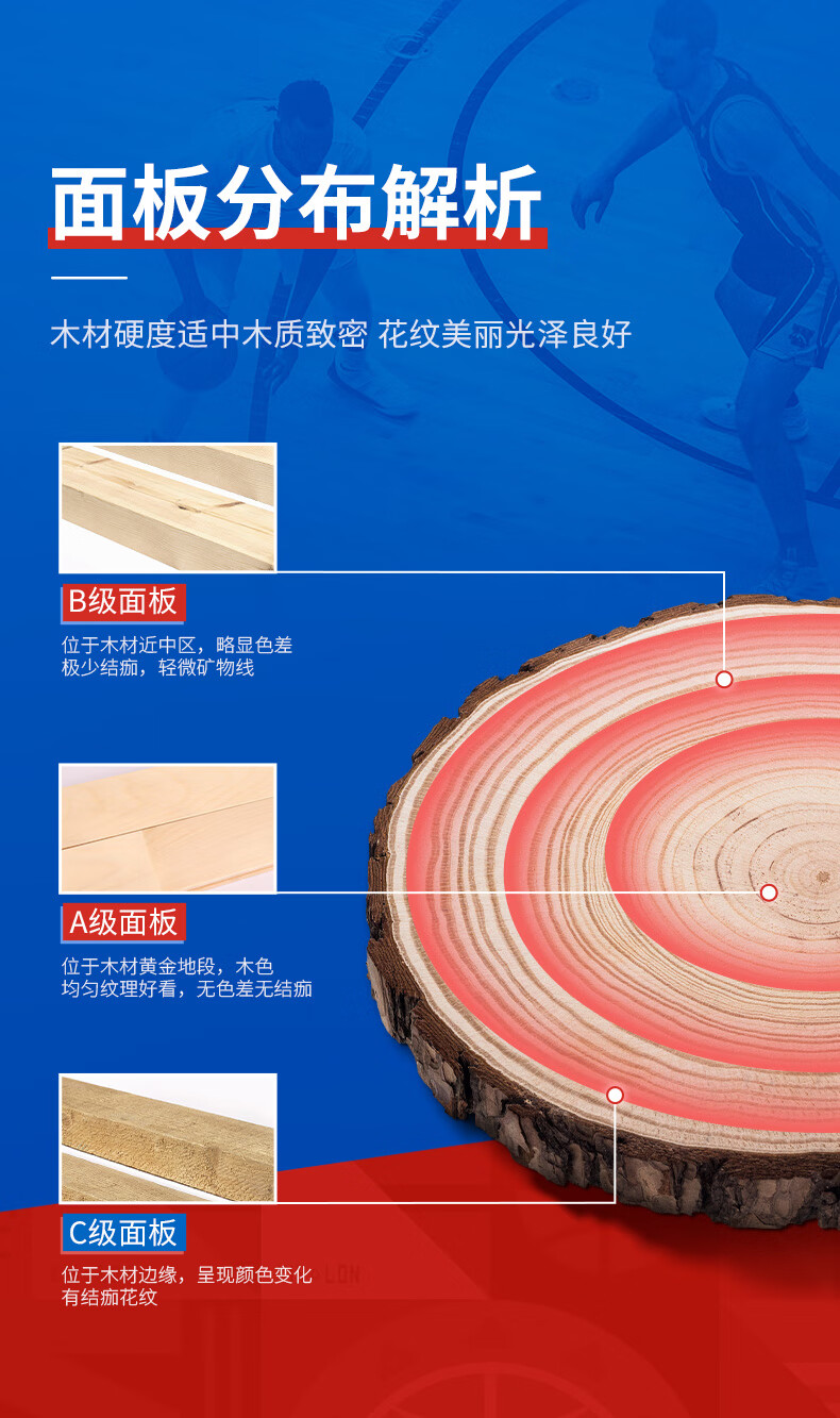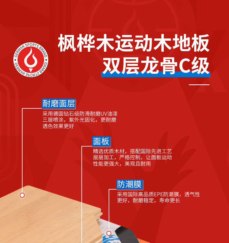 健伦篮球场实木运动地板室内体育馆羽毛球场舞蹈室枫桦木双龙骨C级 自营