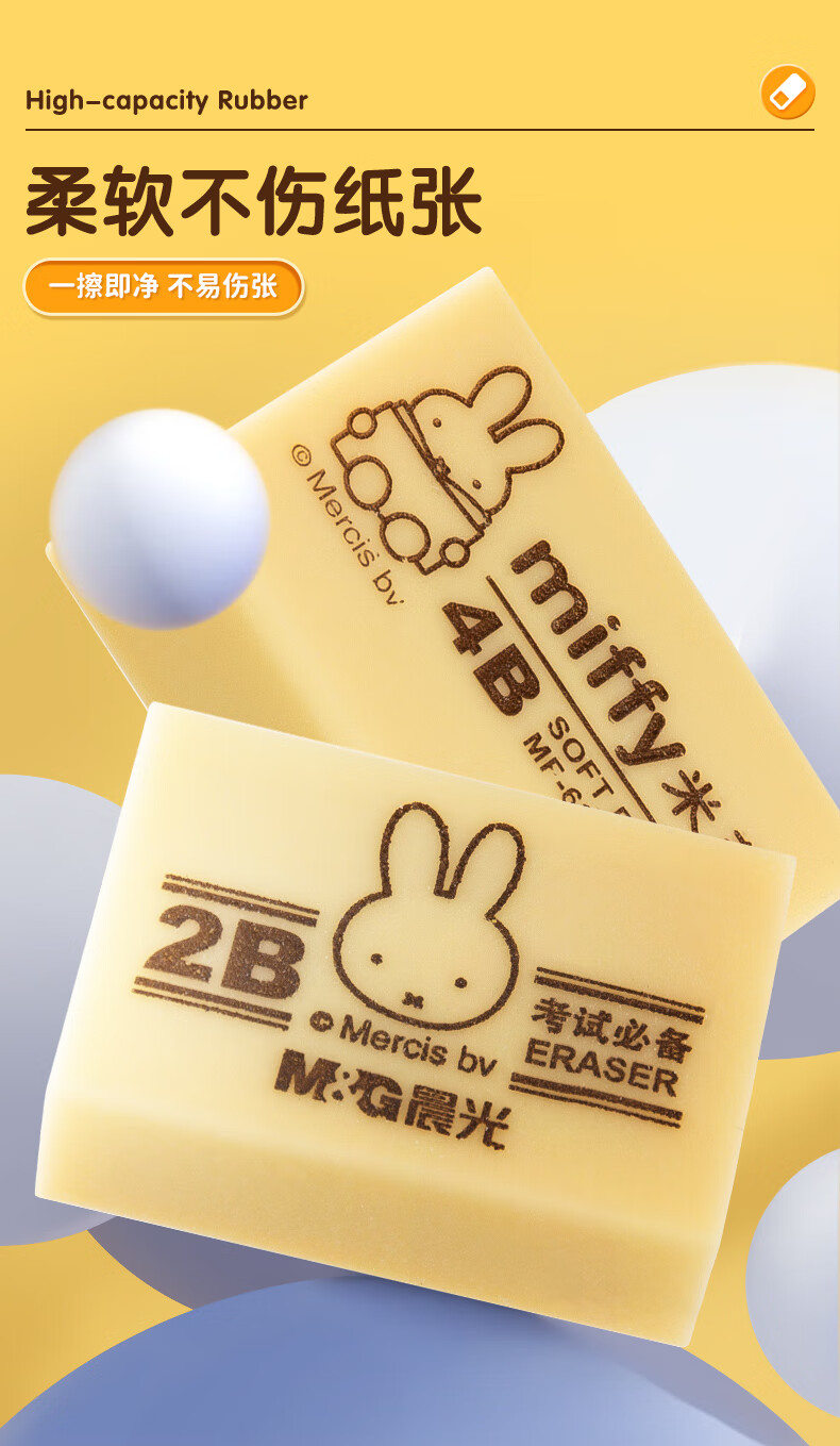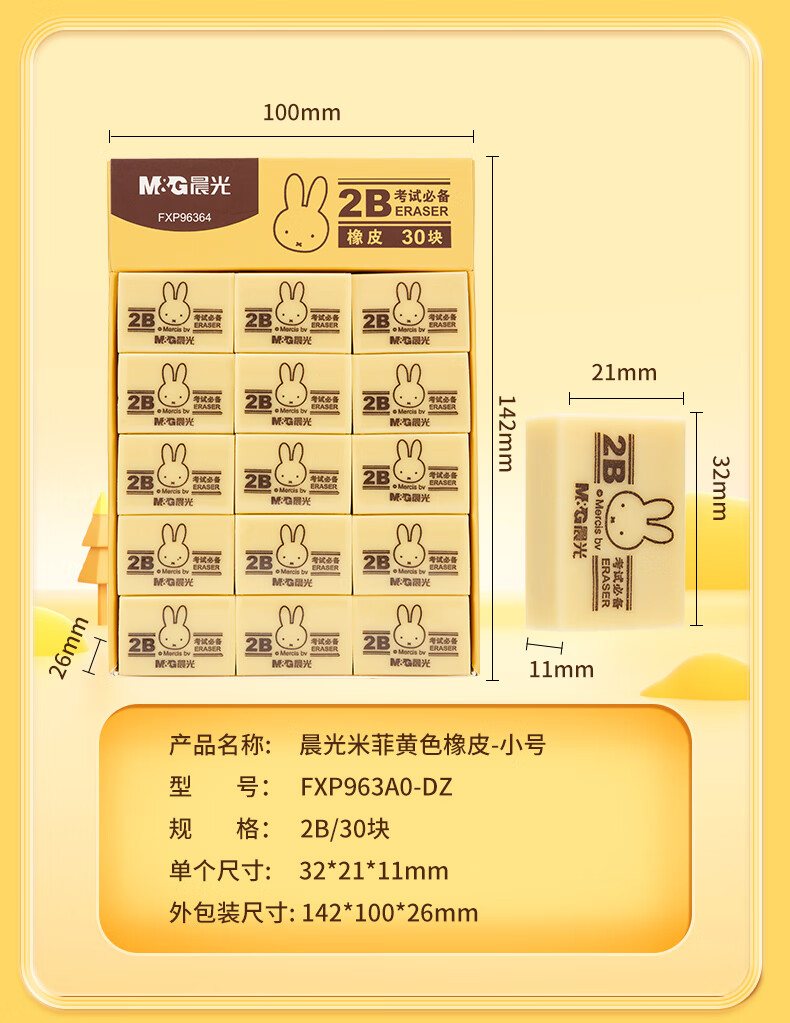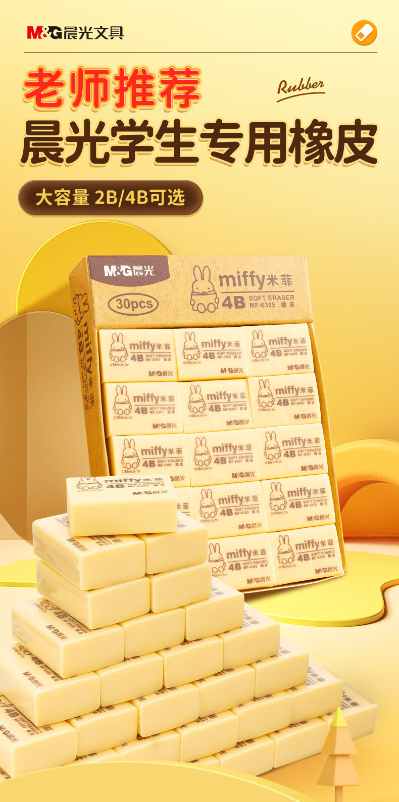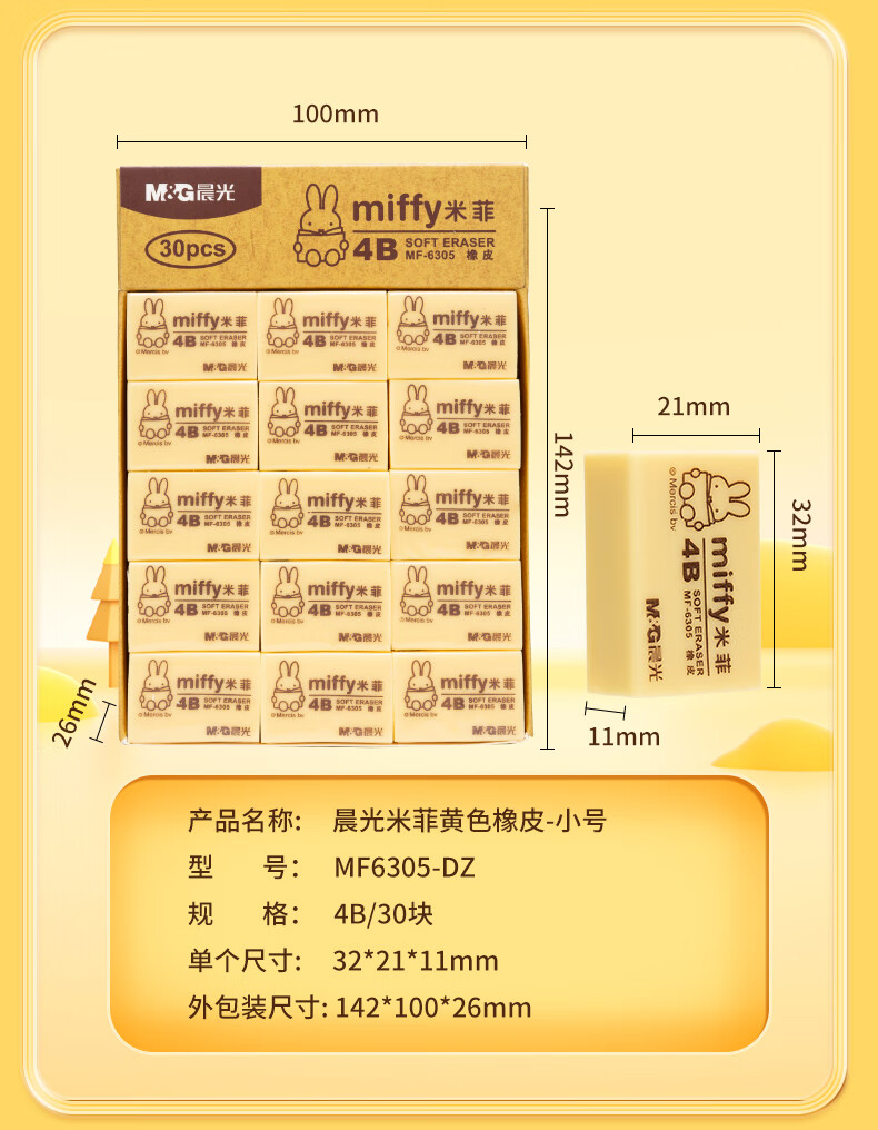 晨光(M&G)文具4B黄色小号橡皮 学生美术绘图考试橡皮擦 米菲系列可爱橡皮擦 30块/盒MF6305 自营